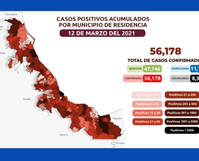 Hasta el corte de este viernes suman 56 mil 178 casos positivos de COVID-19 en el Estado de Veracruz