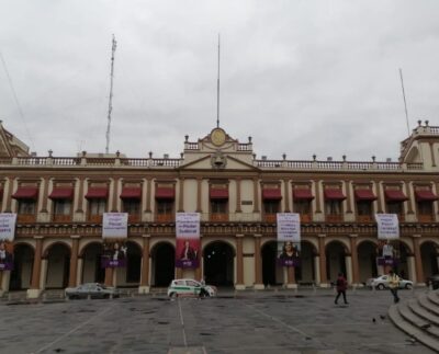 Javier Laertes/ La fachada de palacio de gobierno en Xalapa luce la mañana de este lunes con pendones, los cuales…