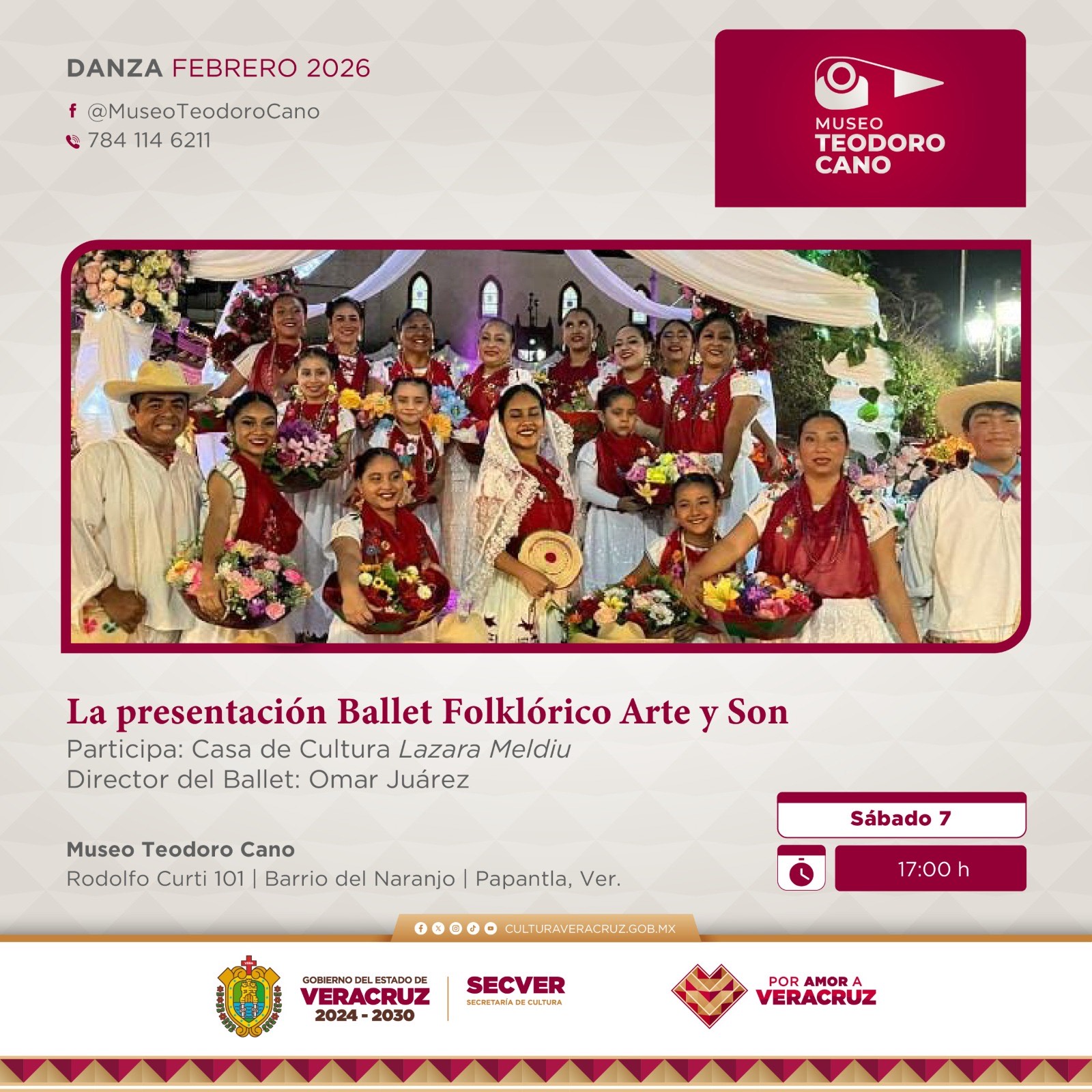 Xalapa, Ver., viernes 06 de febrero de 2026.- La Secretaría de Cultura de Veracruz (SECVER) invita al público en general a asistir a la exhibición de danza del Ballet Folklórico Arte y Son que se llevará a cabo el día sábado 07 de febrero, a las 17:00 horas, en el Museo Teodoro Cano, en Papantla. La entrada es libre.