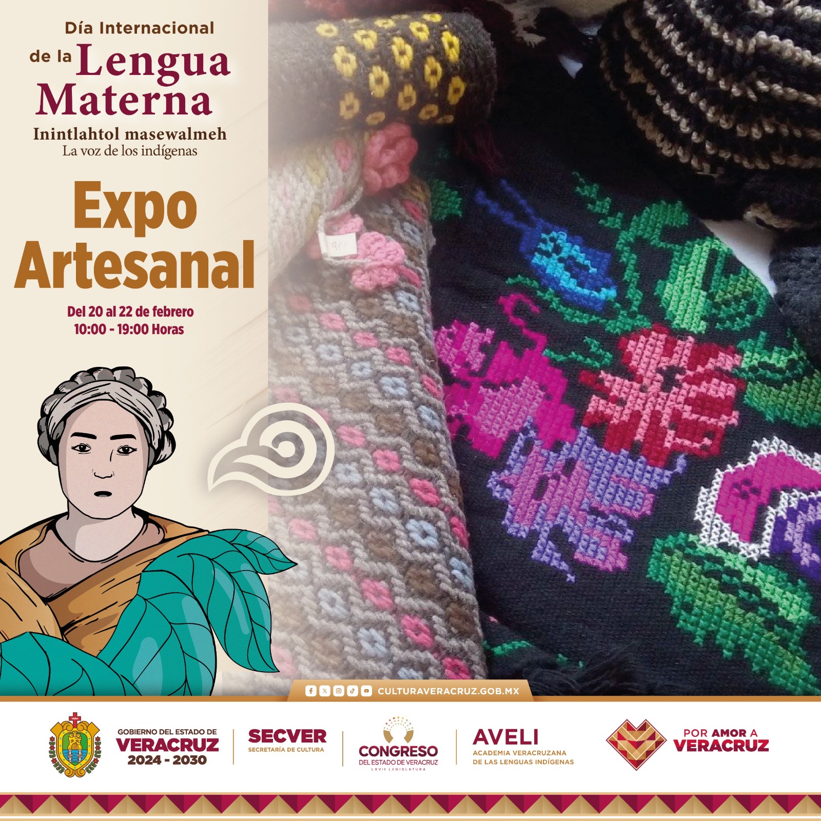 Xalapa, Ver., viernes 20 de febrero de 2026.- La Secretaría de Cultura de Veracruz (SECVER) invita al público en general a ser parte de la expo artesanal que se desarrollará del 20 al 22 de febrero en el Museo de Arte del Estado de Veracruz (MAEV), en la ciudad de Orizaba, con motivo de las actividades por el Día Internacional de la Lengua Materna. La entrada es gratuita.