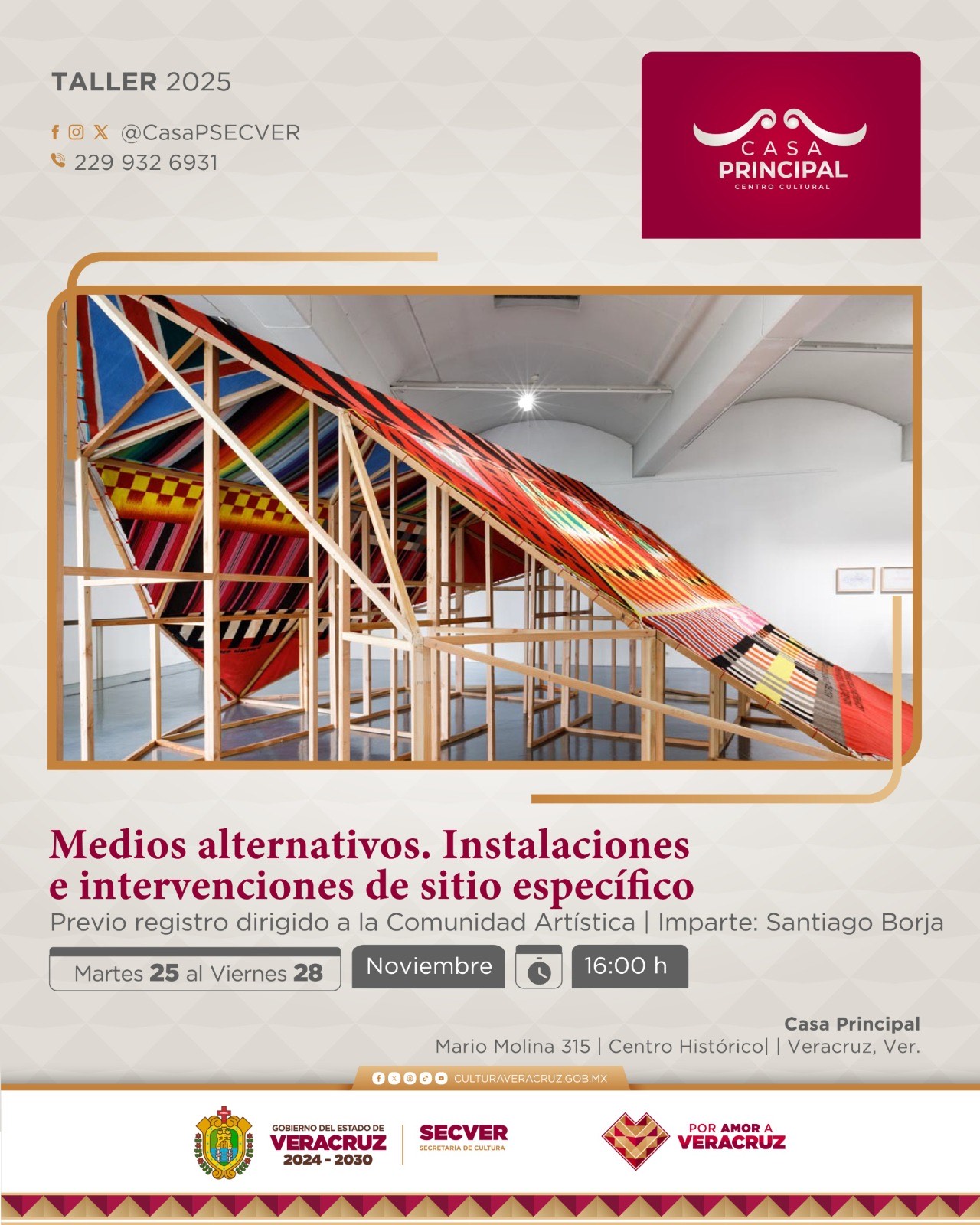 Xalapa, Ver., sábado 22 de noviembre de 2025.-La Secretaría de Cultura de Veracruz (SECVER) invita al público interesado en el arte contemporáneo a participar en el taller teórico-práctico Medios Alternativos. Instalaciones e intervenciones de sitio específico, que serealizará del 25 al 28 de noviembre, en horario de 17:00 a 20:00 horas, en el Centro Cultural Casa Principal, en el puerto de Veracruz. El cupo es limitado.
