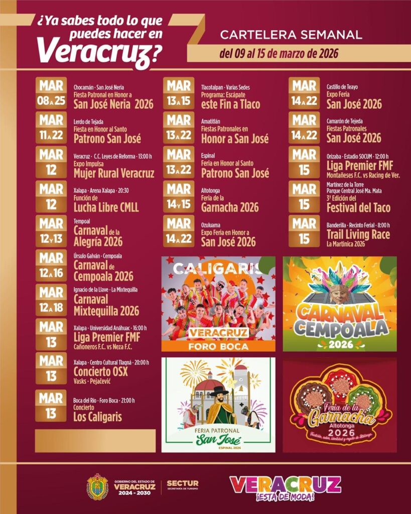Xalapa, Ver., martes 10 de marzo de 2026.- La Secretaría de Turismo (SECTUR) invita a la ciudadanía y a visitantes a disfrutar de la cartelera semanal de actividades que se realizarán en distintas regiones, con festividades patronales, carnavales, conciertos, eventos deportivos y encuentros gastronómicos que reflejan la diversidad cultural y turística de Veracruz.