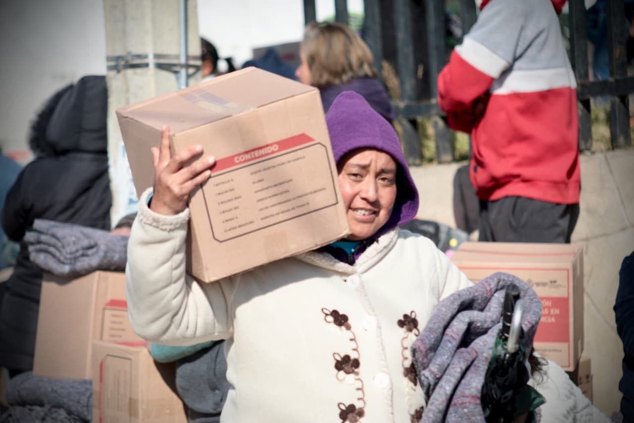 Cada familia recibió dos cobijas y dos cajas de alimentos, además de atención directa mediante una brigada de vacunación que aplicó dosis contra COVID-19 e influenza, para fortalecer la protección sanitaria durante el invierno.