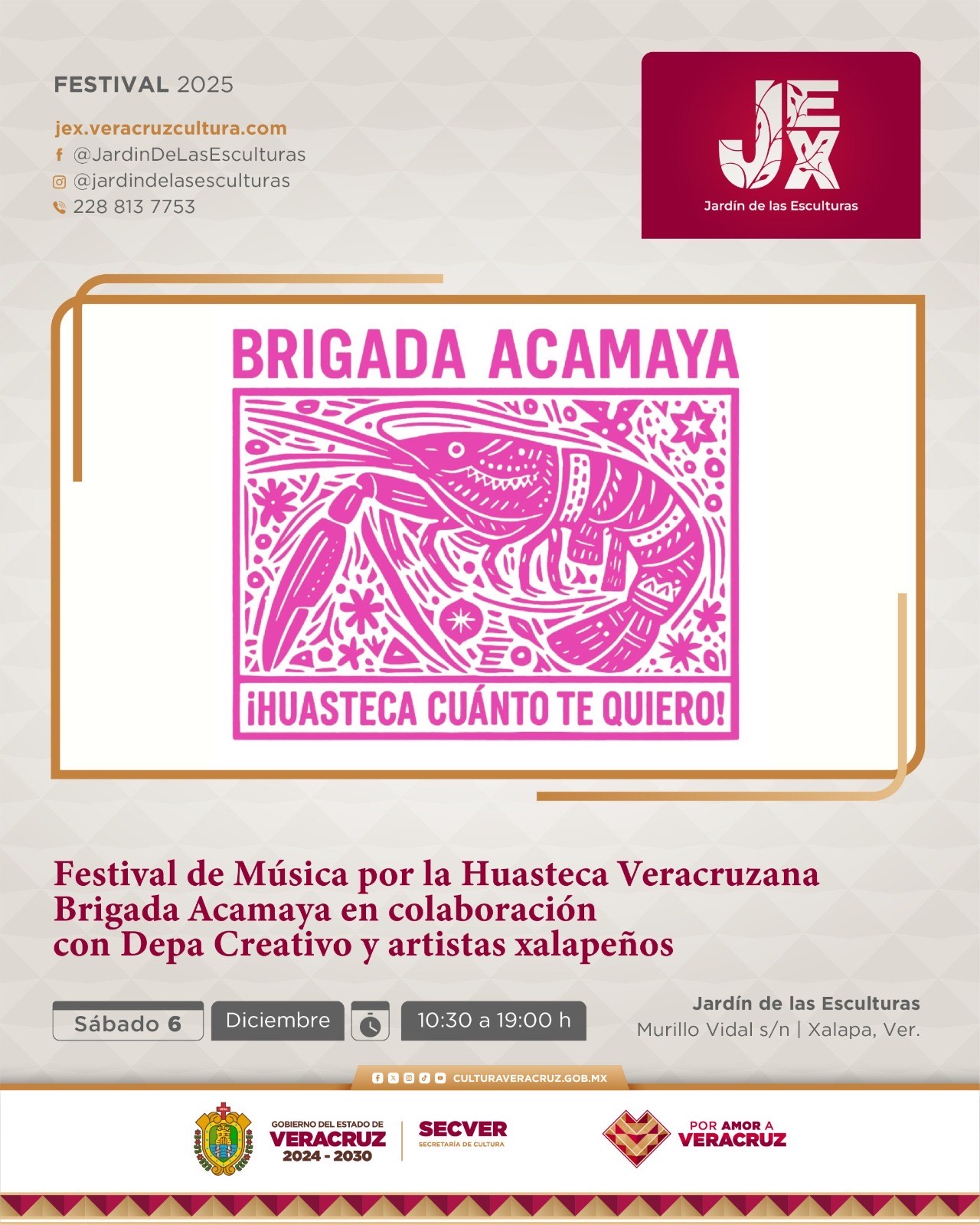 Xalapa, Ver., jueves 04 de diciembre de 2025.- La Brigada Acamaya, el Colectivo Bugambilia y el DepaCreativo invitan al público al Festival de Música por la Huasteca, que se llevará a cabo el día sábado 6 de diciembre en la explanada del Jardín de las Esculturas de Xalapa (JEX), recinto de la Secretaría de Cultura de Veracruz (SECVER), de 10:30 a 19:00 horas.