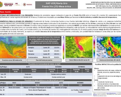 Xalapa, Ver., domingo 28 de diciembre de 2025.– La Secretaría de Protección Civil (PC) informa que, ante el pronóstico para este lunes de…
