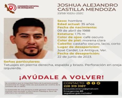 Xalapa, Ver.-Los familiares de Joshua Alejandro Castilla Mendoza lo reportaron como desaparecido. Tiene 35 años de edad y la última…