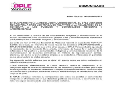 XALAPA, VER.- El Organismo Publico Local Electoral (OPLE), anunció que no realizará los trabajos de consulta a los pueblos y…