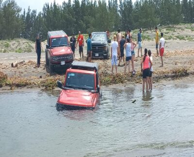 Úrsulo Galván, Ver.-En la playa de Juan Ángel municipio de Úrsulo Galván, una camioneta Bronco quedó atorada en un “brazo…