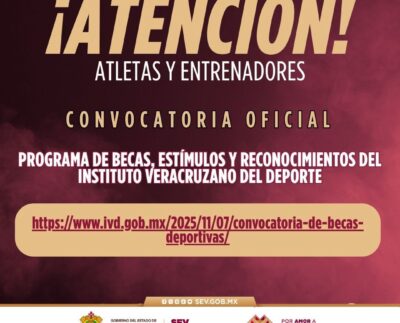 Veracruz, Ver., domingo 09 de noviembre 2025.- El Gobierno del Estado, a través del Instituto Veracruzano del Deporte (IVD), publica la Convocatoria del Programa de Becas Deportivas del…