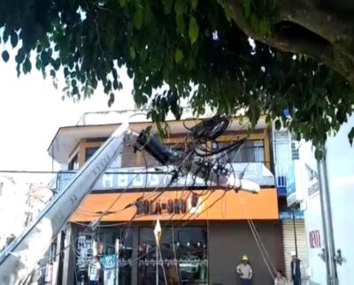 Francisco De Luna / Xalapa, Ver.-En la avenida 20 de noviembre tres postes de energía eléctrica fueron derribados por un…