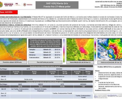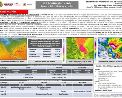 Xalapa, Ver., sábado 10 de enero de 2026.– LaSecretaría de Protección Civil mantiene activa la Alerta Gris del Sistema de Alerta…