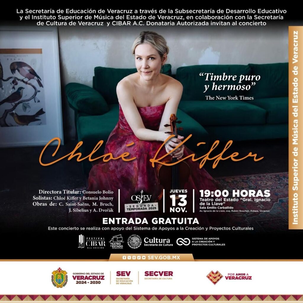 Xalapa, Ver., jueves 13 de noviembre de 2025.– La Secretaría de Educación de Veracruz (SEV) invita al concierto de la segunda temporada 2025 de la Orquesta Sinfónica Juvenil del Estado de Veracruz (OSJEV), que contará con la participación especial de la reconocida violinista internacional Chloé Kiffer, elogiada por TheNew York Times por su timbre puro y hermoso.