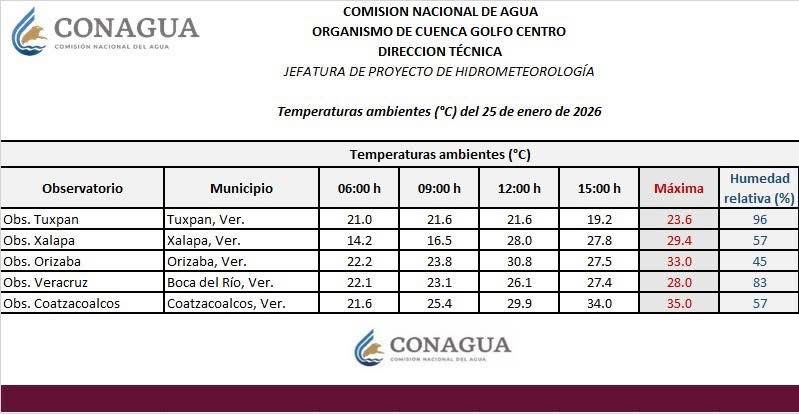 En otras zonas del estado, las temperaturas también fueron elevadas. Coatzacoalcos encabezó los registros con 35.0 grados Celsius, mientras que en Boca del Río se alcanzaron los 28.0 grados con una humedad del 83 por ciento. En contraste, Tuxpan, al norte de la entidad, presentó condiciones más templadas, con una máxima de 23.6 grados y una humedad del 96 por ciento.