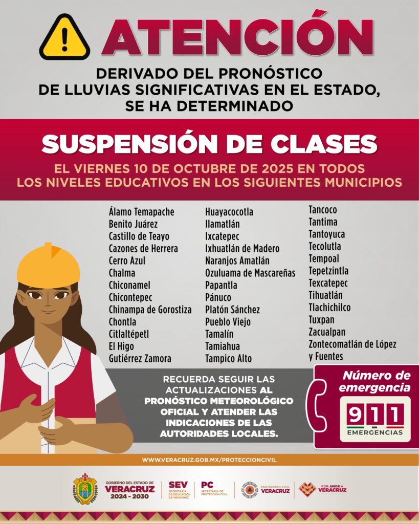 Xalapa, Ver., jueves 09 de octubre de 2025.– Tras el análisis de los pronósticos meteorológicos, el ComitéEstatal de Emergencias, en coordinación con la Secretaríade Educación, extiende la suspensión de clases y actividades administrativas en 38 municipios de la zonanorte para este viernes 10 de octubre, con el objetivo de garantizar la seguridad de estudiantes, docentes y personal escolar: