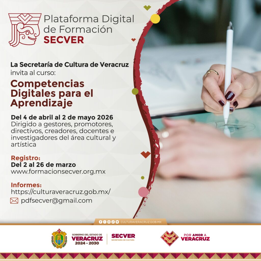 Xalapa, Ver., lunes 09 de marzo de 2026.- La Secretaría de Cultura de Veracruz (SECVER) invita a participar en el curso virtual Competencias Digitales para el Aprendizaje 2026, que estará disponible del 04 de abril al 02 de mayo en la plataforma https://www.formacionsecver.org.mx/,con inscripción previa.