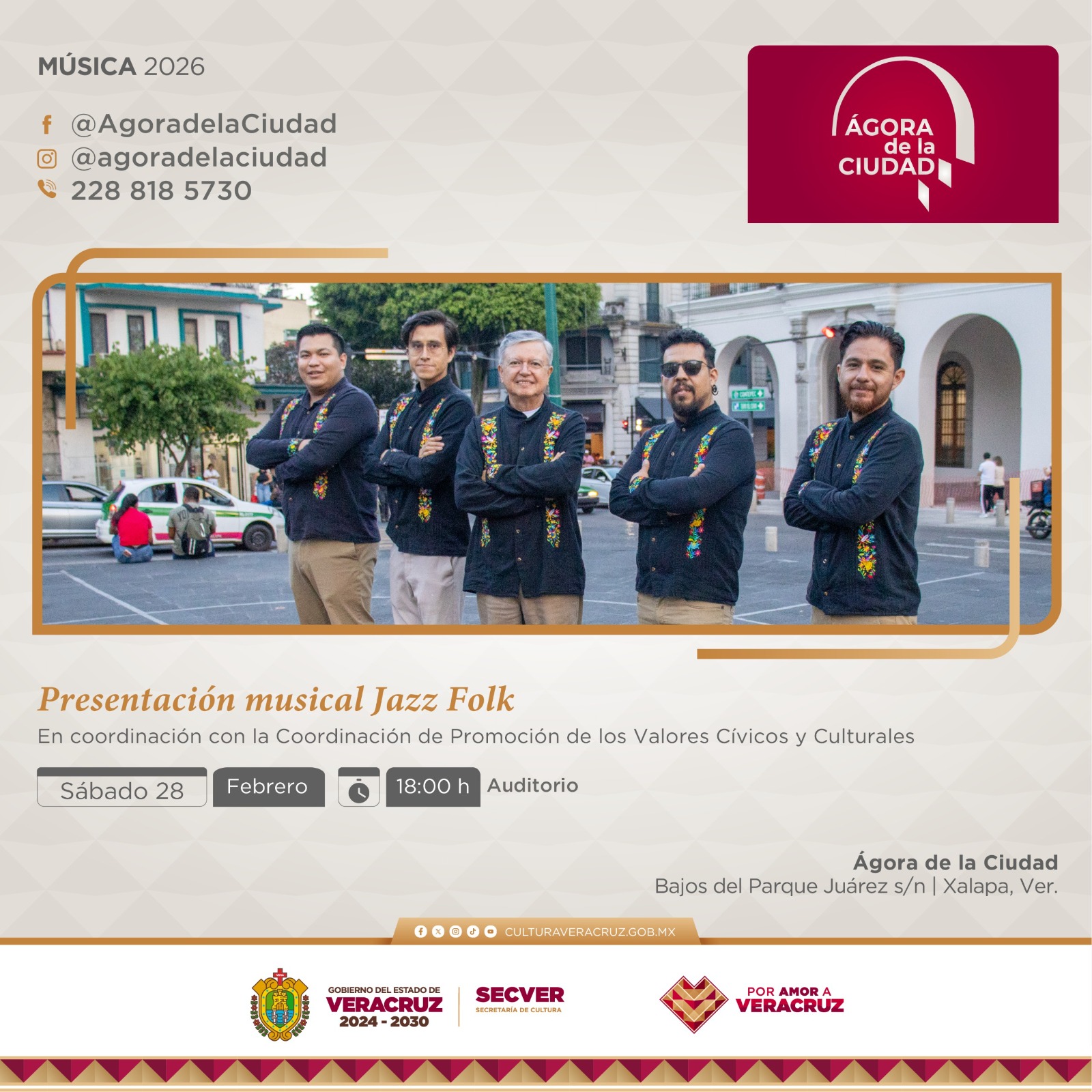 Xalapa, Ver., jueves 26 de febrero de 2026.- La Secretaría de Cultura de Veracruz, en colaboración con la Coordinación de Promoción de los Valores Cívicos y Culturales de la Secretaría de Gobierno, invita al concierto gratuito de la agrupación Jazz Folk, el sábado 28 a las 18:00 horas, en el Auditorio del Ágora de la Ciudad.