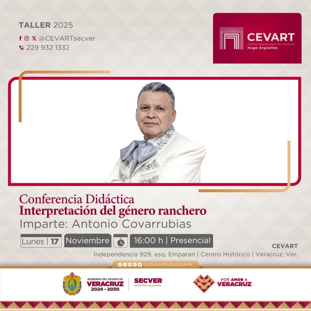 Veracruz, Ver., domingo 16 de noviembre de 2025.- La Secretaría de Cultura de Veracruz (SECVER) invita al público a participar en el laboratorio creativo Conferencia didáctica: Interpretación del género ranchero, el lunes 17 de noviembre, a las 16:00 horas, en el Centro Veracruzano de las Artes Hugo Argüelles (CEVART), en el puerto de Veracruz. El taller es totalmente gratuito y requiere registro anticipado.