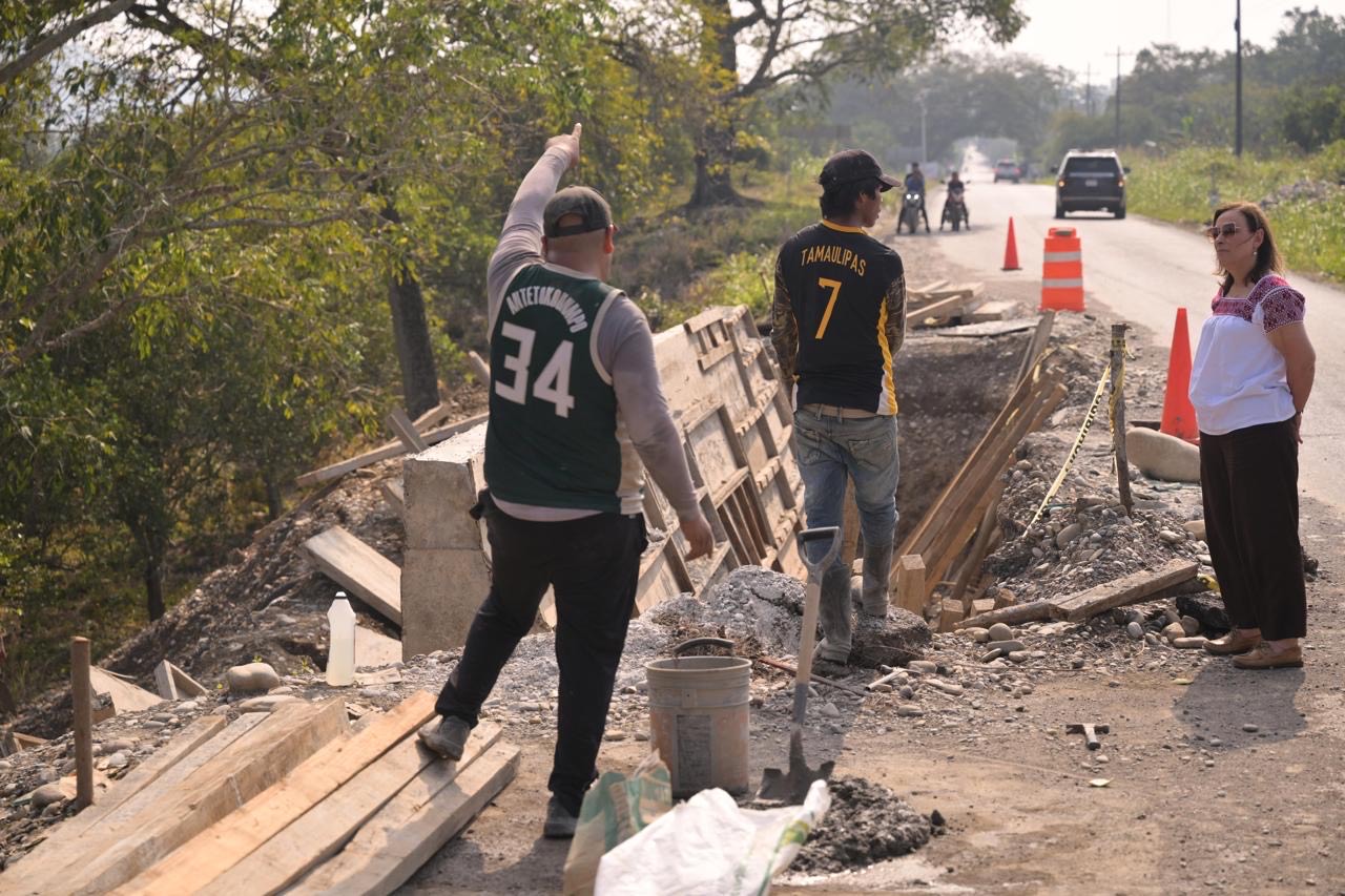 En Ixcatepec, instruyó a garantizar la calidad de la obra y el cumplimiento de los tiempos de ejecución para restablecer de manera segura la conectividad en un tramo afectado por una socavación provocada por las lluvias, al tratarse de una vía que conecta el entronque con la carretera federal.