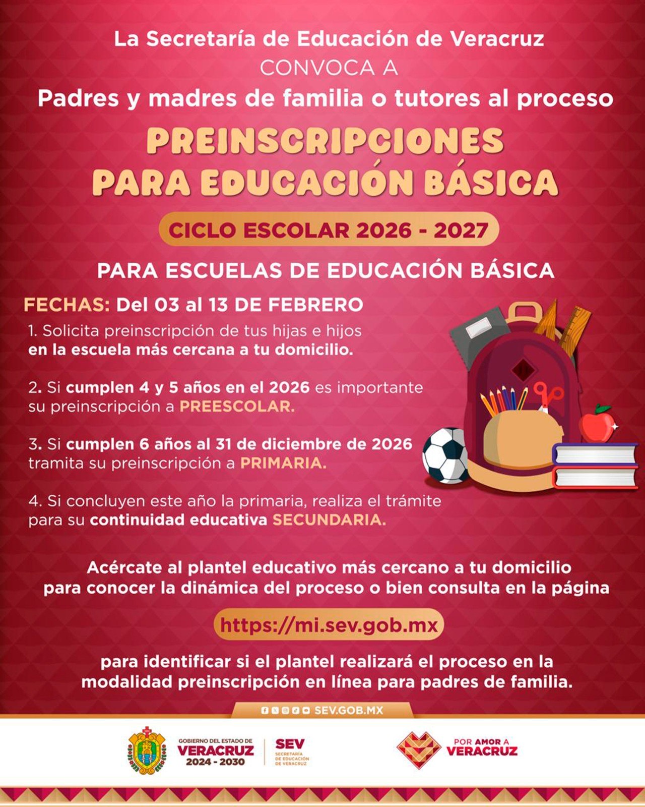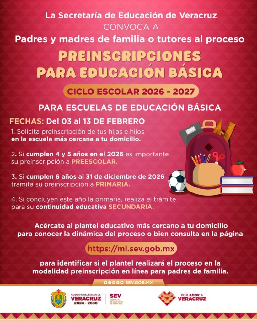 Xalapa, Ver., domingo 25 enero de 2026.– La Secretaría de Educación de Veracruz (SEV) informa que del 03 al 13 de febrero tendrá lugar el proceso de preinscripciones para escuelas públicas y privadas de Educación Básica, correspondiente al ciclo escolar 2026–2027.