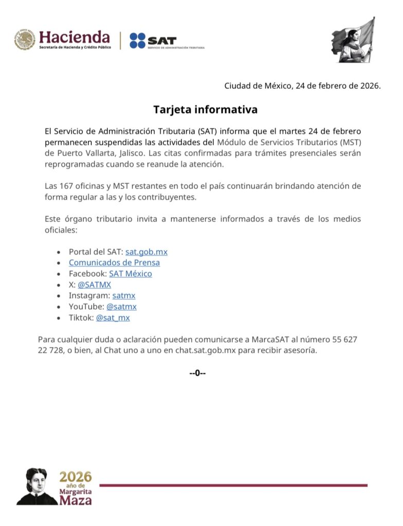 El Servicio de Administración Tributaria (SAT) informa que el martes 24 de febrero permanecen suspendidas las actividades del Módulo de Servicios Tributarios (MST) de Puerto Vallarta, Jalisco. Las citas confirmadas para trámites presenciales serán reprogramadas cuando se reanude la atención.
