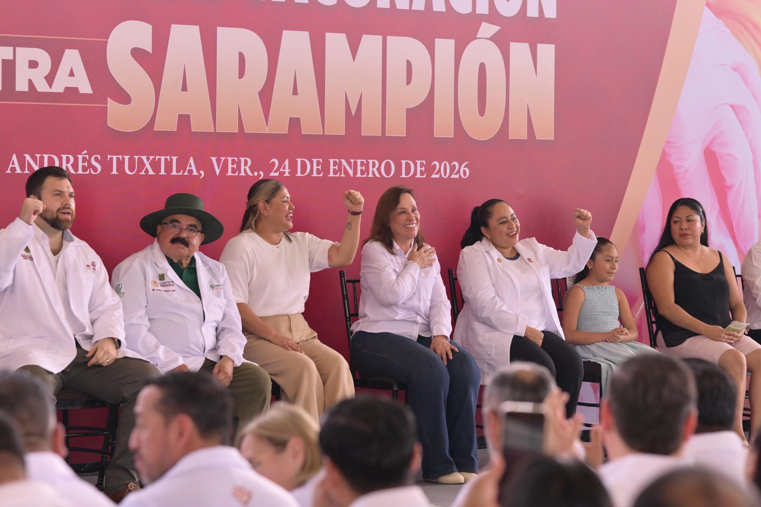 San Andrés Tuxtla, Ver., sábado 24 de enero de 2026.-La gobernadora Rocío Nahle García, junto con autoridades de salud estatal y federal, dio el arranque a la Campaña estatal intensiva contra el sarampión, para evitar brotes o casos aislados en Veracruz mediante una cobertura total de vacunación.